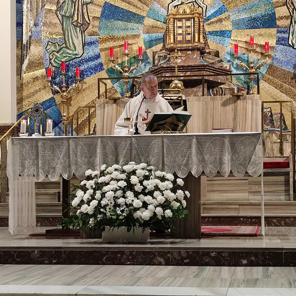 Presidió la celebración el H. Valentín Martín, que estuvo muy fraternal en la homilía, hablando de Fray Leopoldo toda la homilía. En el altar estaba la imagen del Beato y un bello relicario con una reliquia insigne, que se dio a besar al final de la misa.